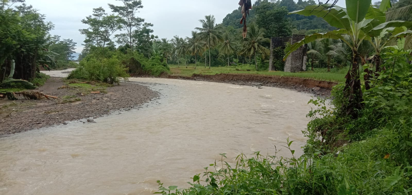 Dari pantauan di lokasi, selain menggerus saluran irigasi, banjir juga menggerus 8 kotak sawah warga, menghanyutkan 1 unit alat pemotong kayu, dan nyaris merobohkan satu unit rumah semi permanen.
