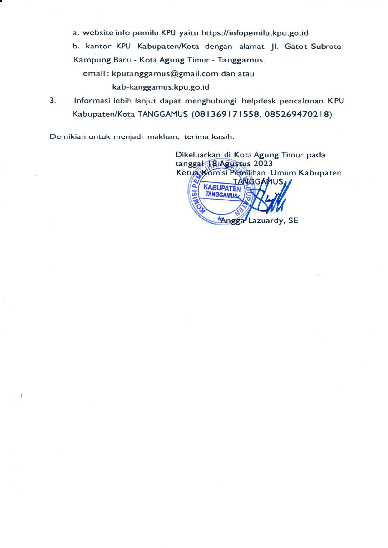 Berikut ini pengumuman DCS Anggota DPRD Tanggamus Dalam Pemilihan Umum 2024 beserta lampiran yang dikeluarkan KPU Tanggamus.