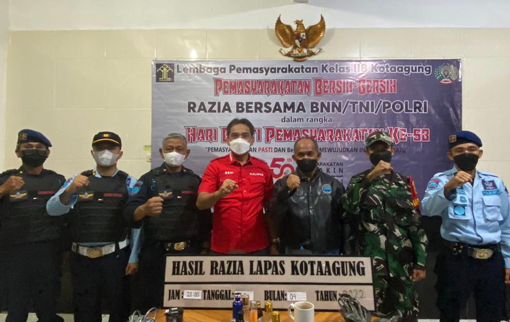 Jejamo.com, Tanggamus – Lapas Kelas II B Kota Agung menggandeng BNN Tanggamus dan Kodim 0424 dalam rangka melakukan razia kamar hunian usai salat tarawih pada Kamis malam kemarin, 21/4/2022. Razia gabungan tersebut dilaksanakan serentak di seluruh lapas dan rutan, dalam rangka Hari Bakti Pemasyarakatan ke-58.