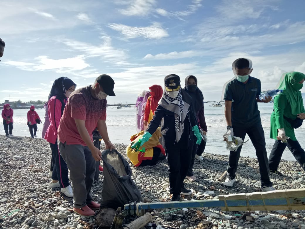 Bupati Tanggamus Dewi Handajani (tengah) membersihkan pantai dari sampah, Jumat, 21/1/2022. | Dok.