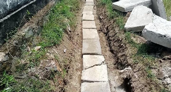 Berdasarkan pantauan Jejamo.com di lokasi, terdapat lebih dari 50 paving blok tidak layak pakai dengan kondisi retak, pecah, bahkan gompal yang terpasang berjajar baik di dasar maupun di dinding saluran irigasi itu.