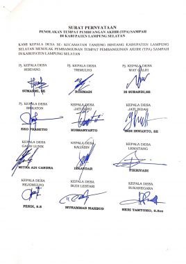 Jejamo.com, Lampung Selatan – Seluruh kepala desa dari 17 kecamatan se-Kabupaten Lampung Selatan menolak rencana Pemerintah Provinsi Lampung yang akan membangun Tempat Pembuangan Akhir (TPA) sampah di wilayah mereka.