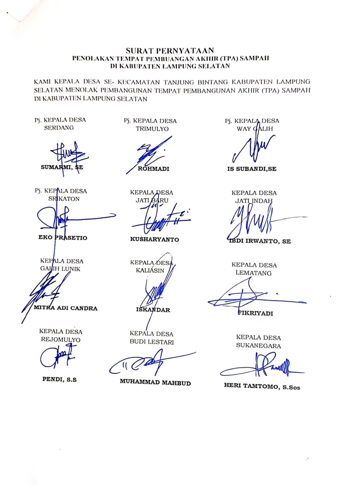 Sekretaris Asosiasi Pemerintah Desa Seluruh Indonesia (Apdesi) Kabupaten Lampung Selatan, Pajri Suryadi, menyatakan, seluruh kepala desa satu suara menolak rencana Pemerintah Provinsi Lampung yang akan membangun TPA sampah di Bumi Khagom Mufakat.