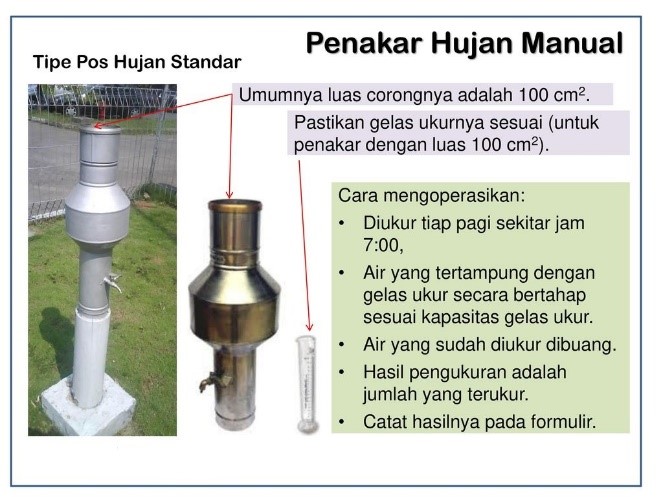 Terdapat dua macam penakar hujan yang lazim digunakan di Indonesia, yaitu penakar hujan manual dan penakar hujan otomatis.