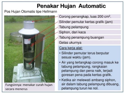 Sementara, penakar curah hujan otomatis dilengkapi pencatat curah hujan dengan kertas grafik mingguan. Pencatatan berupa goresan pena dengan bentuk deretan anak tangga (strip). Setiap anak tangga berukuran 0,5 mm. Kertas grafik memuat 100 anak tangga (100 strip).