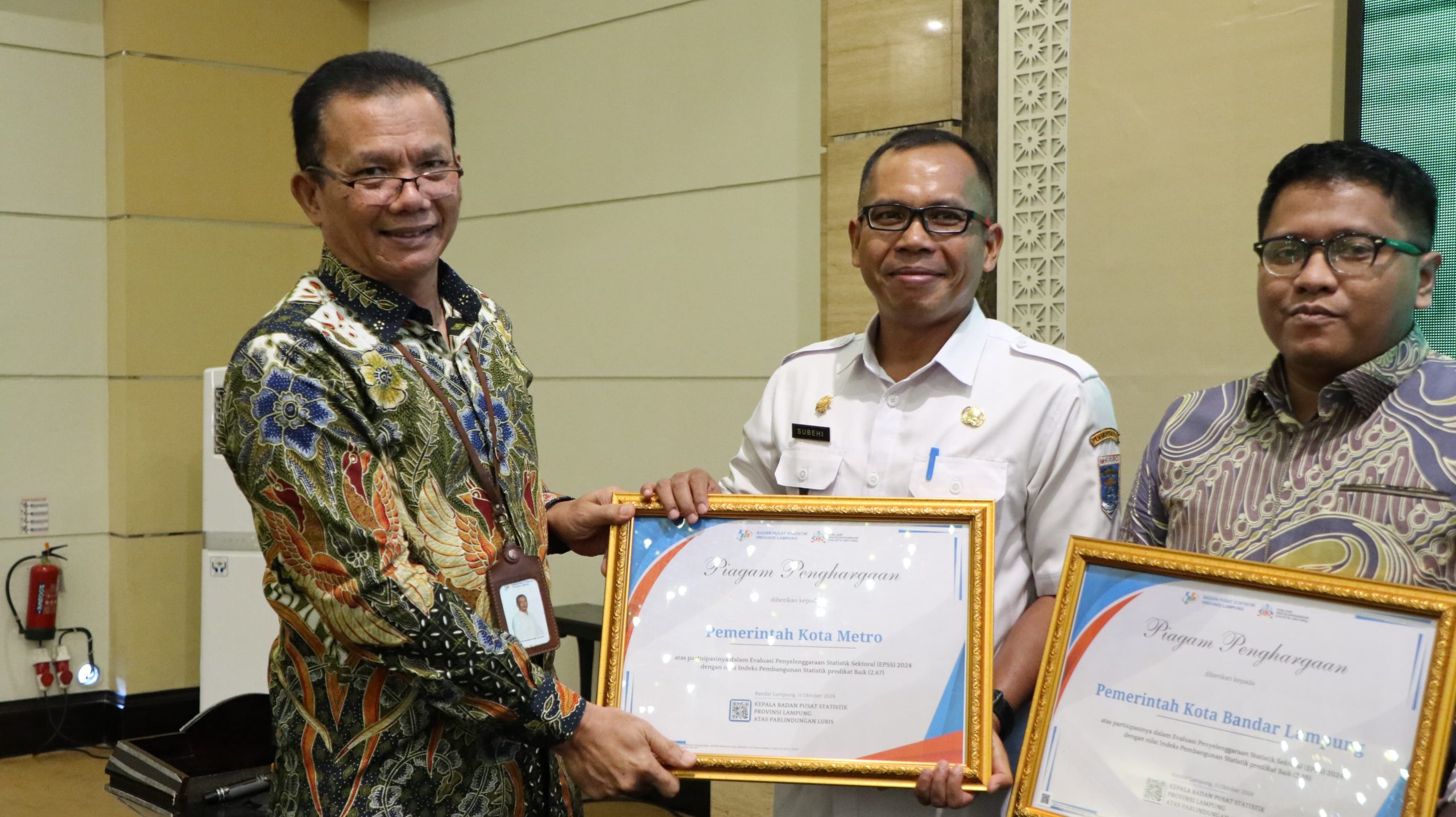 Kepala Diskominfo Kota Metro, Subehi, mewakili Pj. Wali Kota Metro, menerima penghargaan dari BPS Lampung, Rabu, 16/10/2024. | Dok.