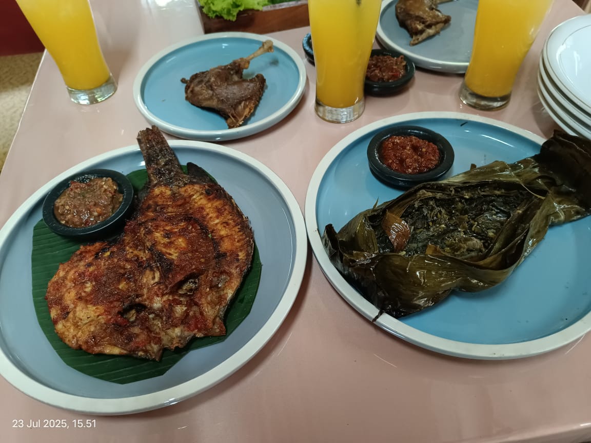 Yang membedakan sajian ini dari kuliner bebek lain adalah karakter smoky-nya yang kuat. Asapnya bukan sekadar efek panggangan, melainkan bagian dari rasa. Kompleks, tapi tetap nyaman di lidah. Disajikan bersama sambal bawang goreng dan lalapan segar dan rebus: dari jengkol muda, janten, terong lalap, kecipir renyah, daun singkong, hingga irisan mentimun yang segar.