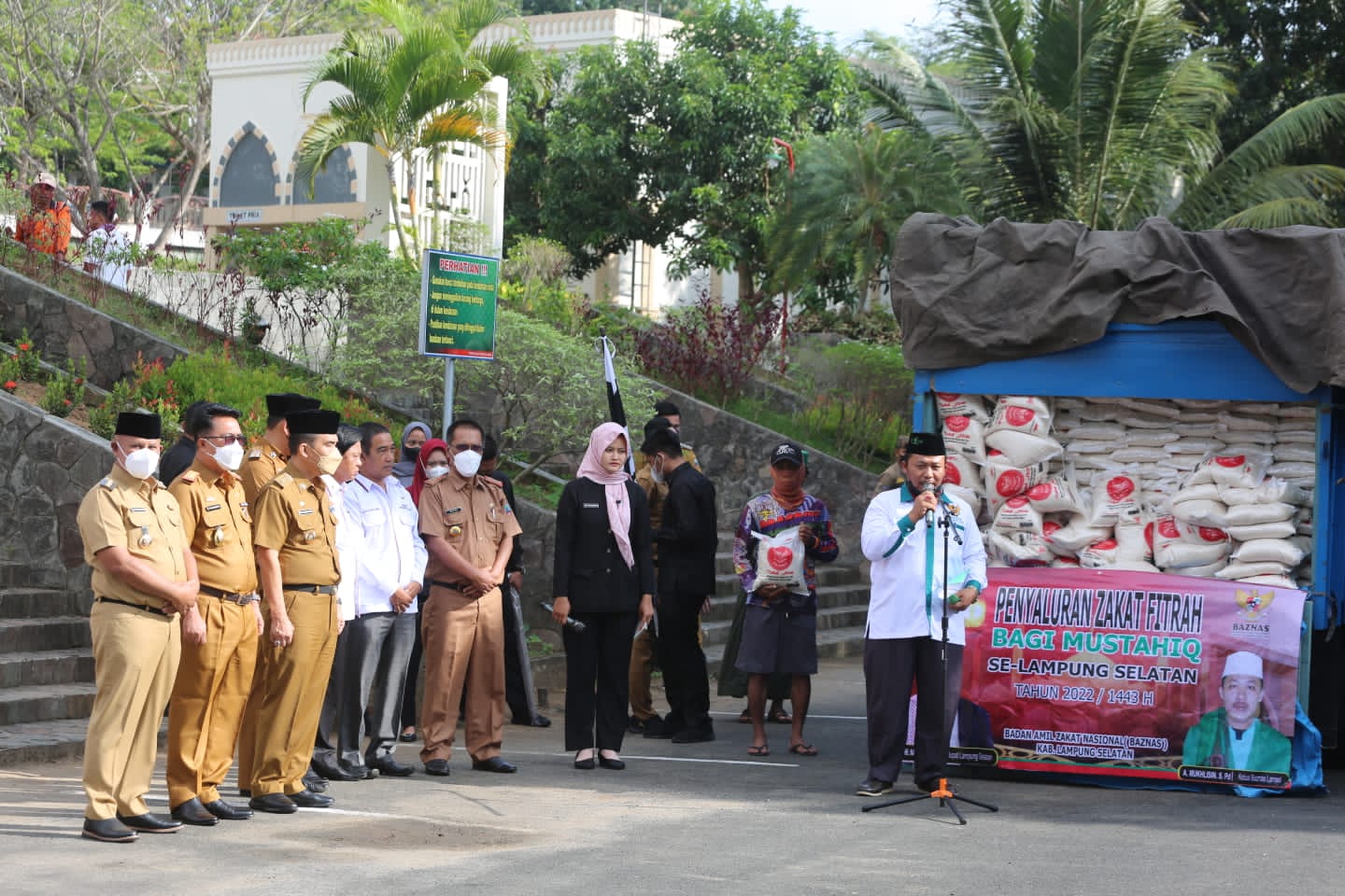 Jejamo.com, Lampung Selatan – Pemerintah Kabupaten Lampung Selatan bersama Badan Amil Zakat Nasional (Baznas) Lampung Selatan menyalurkan bantuan zakat fitrah 10 ton beras bagi mustahik di Bumi Ragom Mufakat. Bupati Lampung Selatan Nanang Ermanto melepas pendistribusian zakat fitrah tersebut di halaman Masjid Agung Kalianda, Senin, 25/4/2022.