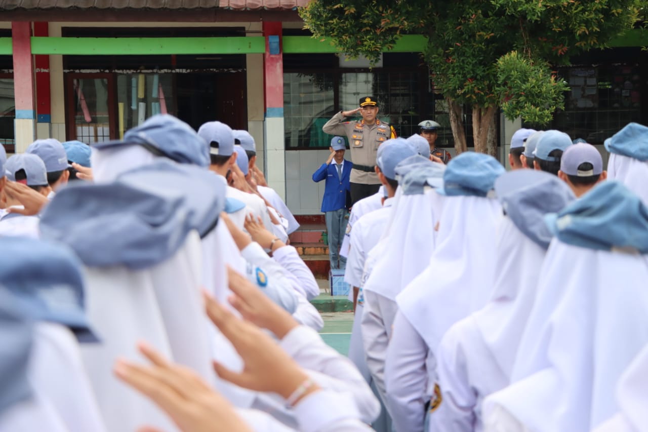 Kapolres Tanggamus AKBP Rinaldo Aser memberikan pesan-pesan positif serta mengedukasi siswa tentang pentingnya kesejahteraan dan keamanan di lingkungan sekolah maupun masyarakat saat menjadi inspektur upacara di SMAN 1 Kota Agung, Senin, 5/2/2024.