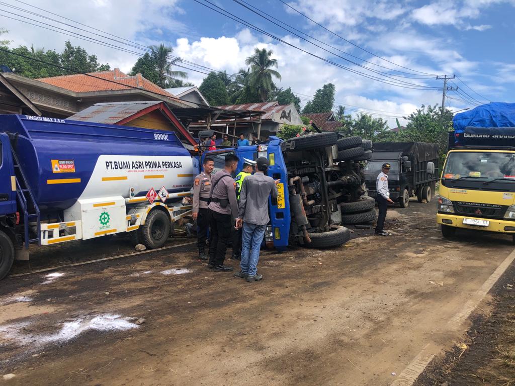 “Kecelakaan truk tanki bermuatan solar dari arah Bandar Lampung menuju ke Bengkulu. Saat di Jalinbar Pekon Teba Bunuk tidak kuat menanjak sehingga mundur dan tergelincir ke arah kiri jalan,” kata Iptu Tjasudin didampingi Kasat Samapta Polres Tanggamus AKP Budi Harto.