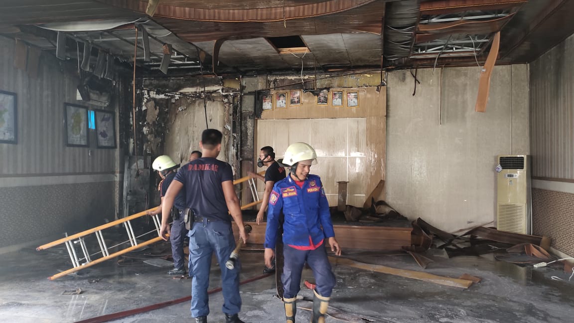 “Kami mendapatkan laporan pukul 13.30 WIB. Dua armada damkar langsung meluncur ke lokasi kejadian dan langsung melakukan pemadaman api di bagian ruang aula rapat. Hanya dalam waktu tujuh menit api berhasil dipadamkan. Adapun kerusakan akibat kebakaran, paling parah di bagian plafon, AC dan kursi, dikarenakan ruangan ini kosong,” jelasnya.