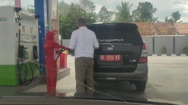 Terlihat kendaraan dinas Kabupaten Tanggamus bernomor polisi BE 1214 VZ yang bertuliskan Tanggamus mengisi BBM jenis Pertalite dengan jumlah 39 liter. Usai melakukan pengisian, pengendara mobil dinas tersebut tampak memberikan tips atau sisa kembalian kepada petugas wanita di SPBU.