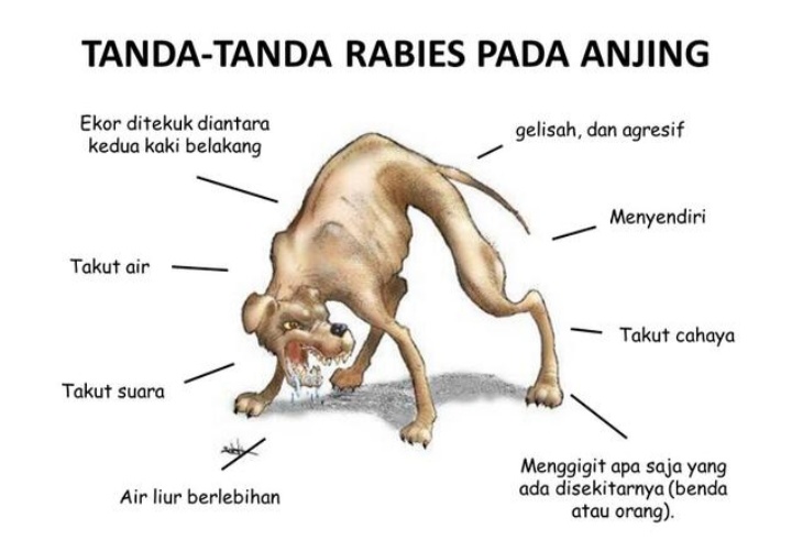 Dijelaskannya, ada 8 tanda anjing terinfeksi rabies yang harus diwaspadai yaitu anjing yang terlihat gelisah dan agresif, sering menyendiri, takut dengan cahaya, takut dengan air, takut dengan suara, air liur yang berlebihan, ekor ditekuk di antara dua kaki, dan mengigit apa saja yang ada disekitarnya. Salah satu hewan yang sering mengalami penyakit ini adalah anjing, khususnya anjing liar yang tidak mendapatkan perawatan dengan baik.