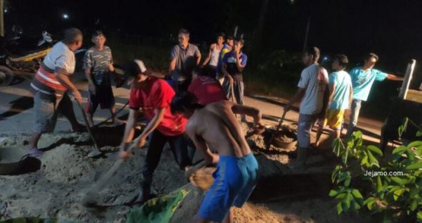 Dari pantauan Jejamo.com, puluhan warga dikomandoi Camat Metro Timur dan Lurah Tejosari, Suwaji, berjibaku menambal sejumlah lubang di ruas jalan yang terletak di pinggir saluran irigasi tersebut. Material batu belah yang didapat dari swadaya masyarakat digunakan untuk menambal lubang sebagai fondasi dan kemudian ditutup cor semen. Kegiatan itu dilakukan pada Minggu malam, 2/4/2023, setelah salat tarawih.
